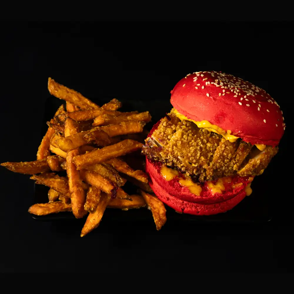 Buns brioché, crevette croustillantes façons karaage, mayo, mangue, wasabi, cheddar, oignons caramélisés, concombres marinés, coleslaw (Accompagné de frites de patates douces)