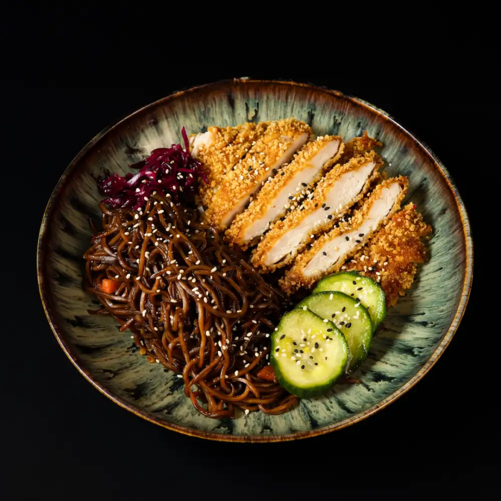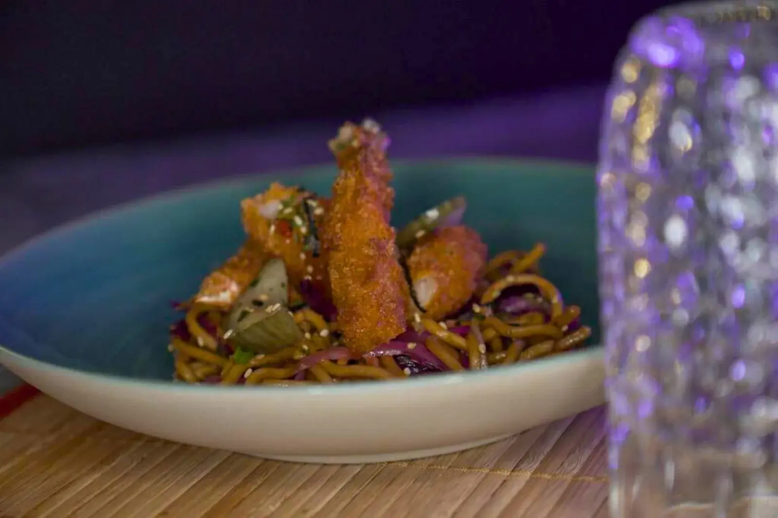 Nouilles sautées aux légumes , poulet pané à la JapAfrik.